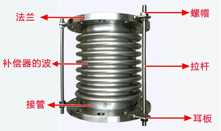 金屬補(bǔ)償器結(jié)構(gòu)圖:(法蘭、螺帽、補(bǔ)償器波、拉桿、接管、耳板)